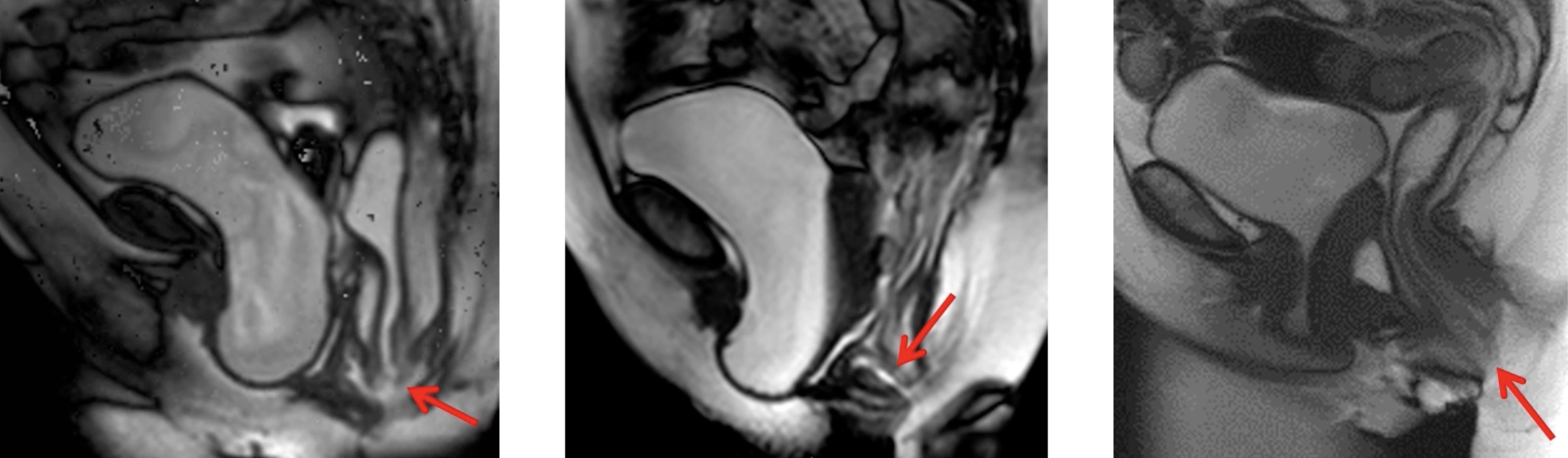 Après balisage vaginal et rectal, séquence 3D T2, séquences sagittale T2 dynamiques en poussée progressive répétée, puis 3 plans T2 en poussée maximale bloquée.