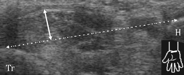 Subluxation ulnaire du tendon extenseur. Pas d'anomalie de son échostructure.
