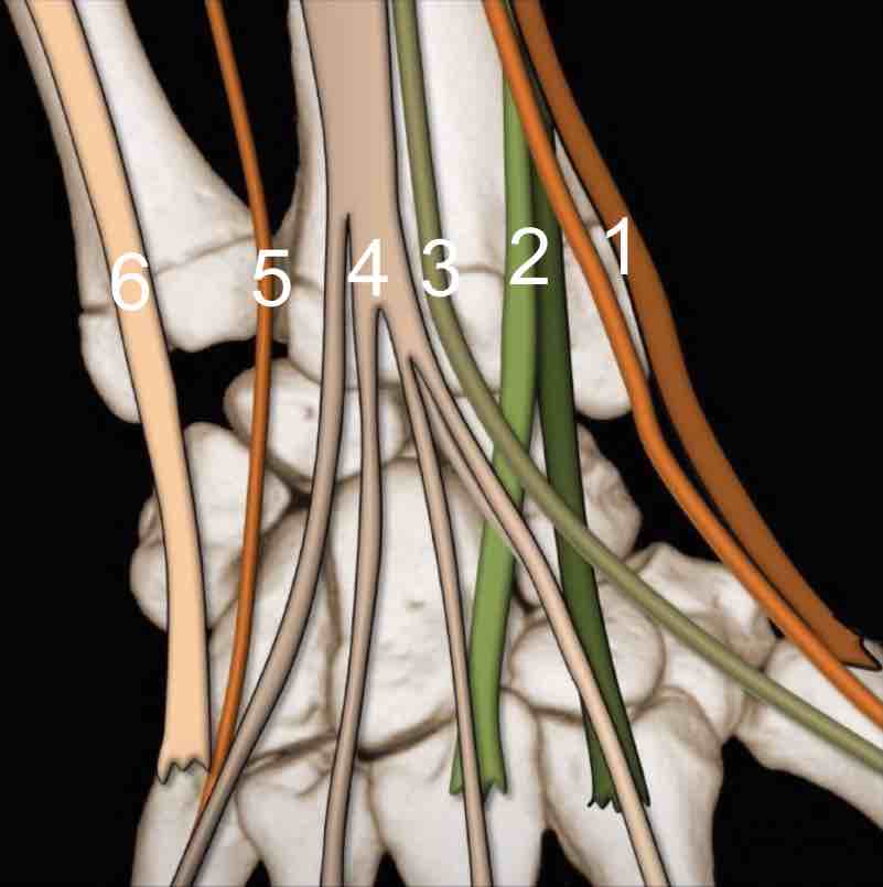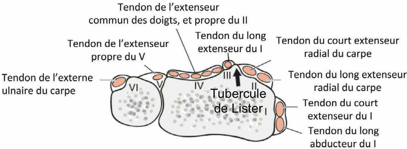 Epaississement rétinaculaire supérieur à 1 mm autour du premier compartiment des extenseurs.