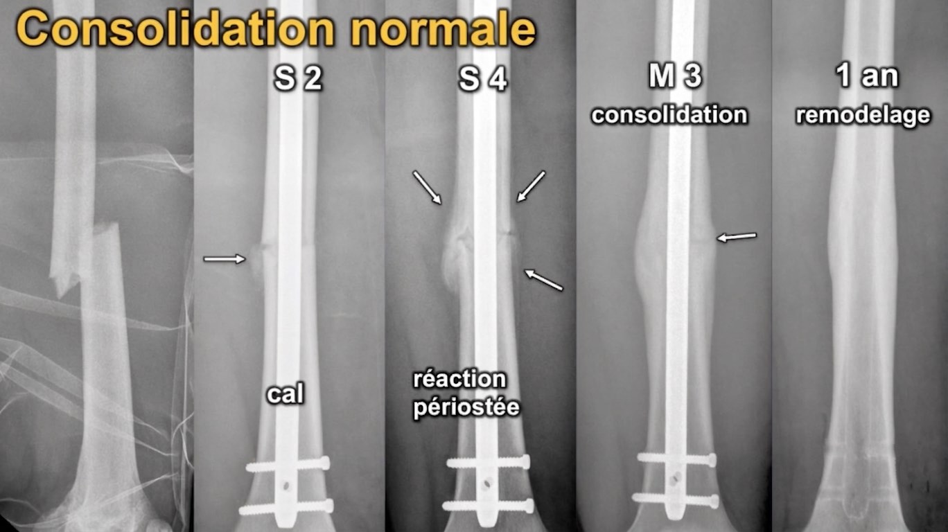 à M6 = pseudarthrose (hypertrophique >> atrophique)