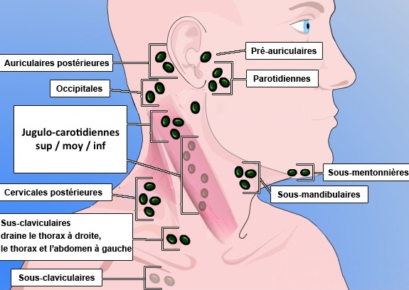Ganglions jugulo-carotidiens supérieurs bilatéraux de petit axe infracentimétrique, de forme ovalaire (rapport grand axe sur petit axe > 2), avec hile hyperéchogène central linéaire, d'échostructure homogène, bien limités, avec un environnement péri-ganglionnaire normal.